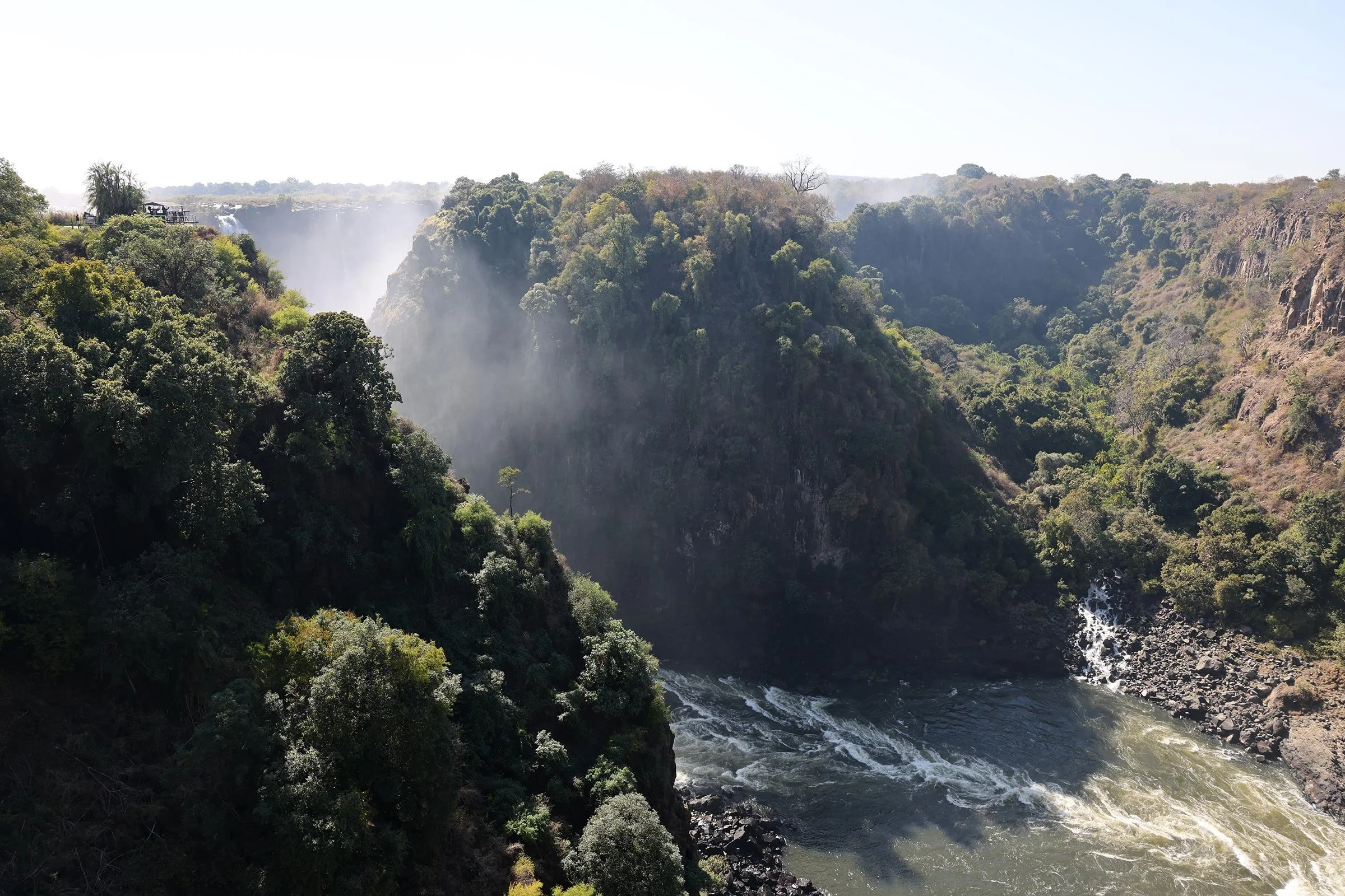 Utsikten mot Victoriafallen från Victoria Falls Bridge är storslagen. Man ser inte så mycket av själva fallen, men den vita dimman ger ett djup till omgivningen och det är just dimman som också gett fallen dess lokala namn, Mosi-oa-Tunya – “röken som dundrar” eller “molnet som åskar”. Gränspassagen vid bron gick smidigt och snart var vi framme vid entrén till nationalparken Mosi-oa-Tunya. Det kostade tjugo amerikanska dollar i entré och personalen var noga med sedlarna, som knappt fick vara det minsta slitna eller vikta.